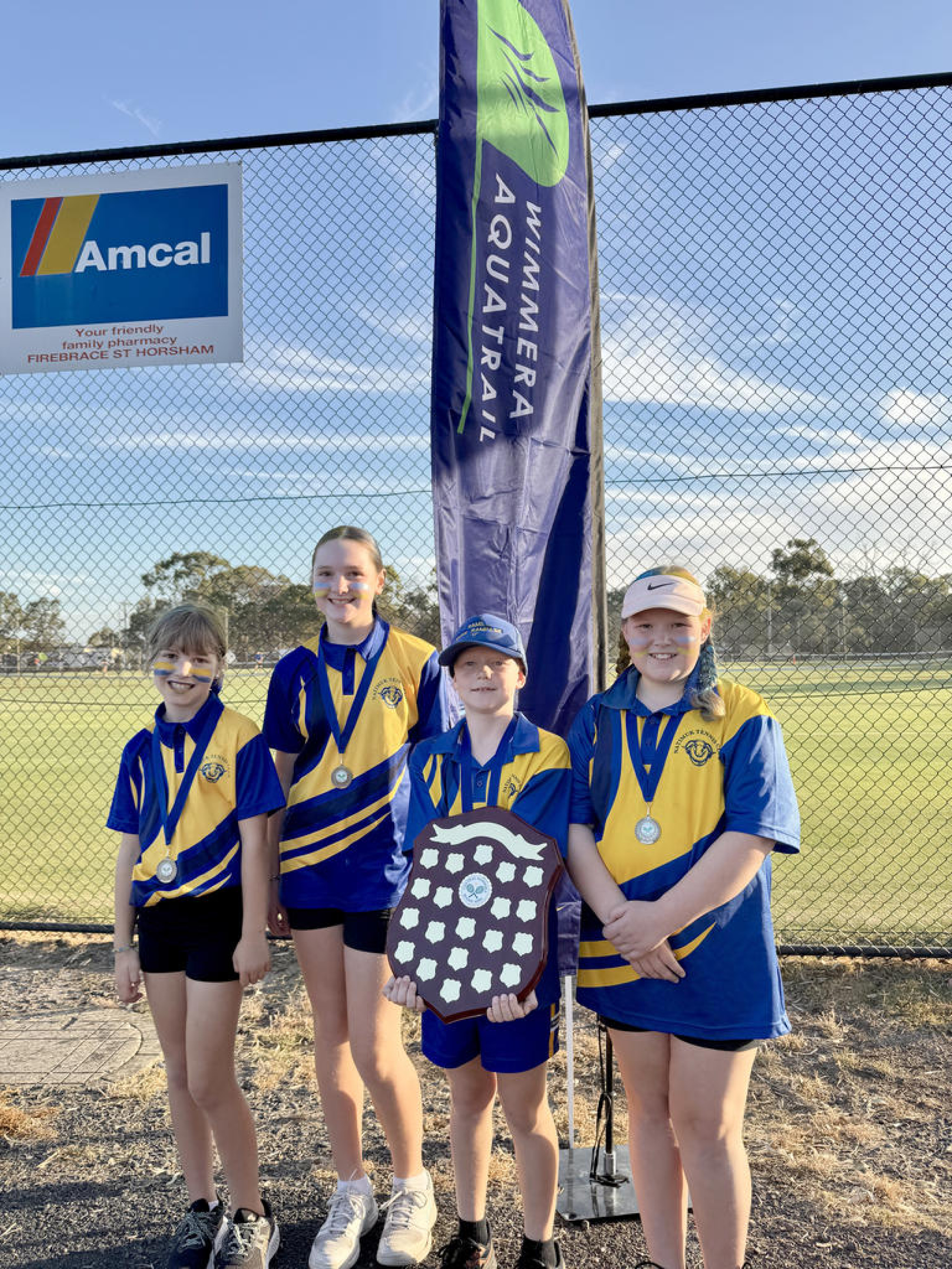 Section 4 girls Zoe Kemp, Ava Ladlow, Zetta Beattie and Greta Smith celebrate their win for Horsham Lawn.